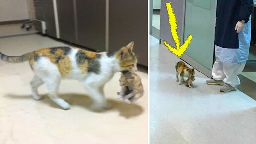 Бродячая кошка принесла своего котёнка в больницу, чтобы немедленно получить помощь.