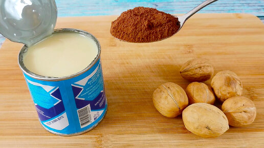 Беру сгущенку, орехи и какао. Получается очень вкусный десерт к чаю