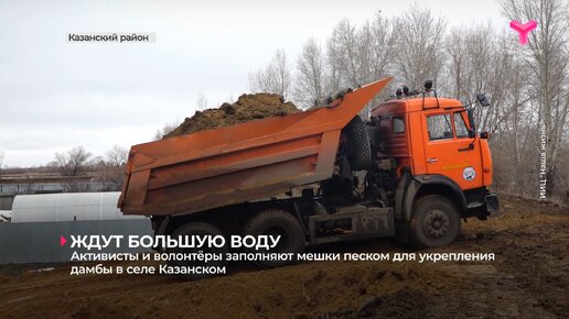 Активисты и волонтёры заполняют мешки песком для укрепления дамбы в селе Казанском