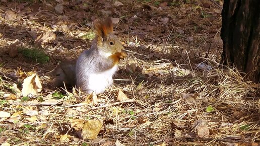 Белка под сосною думает над своей бедой. Забыла где осенью орехи зарыла