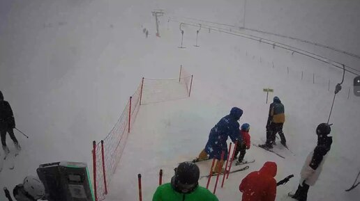 Люди на горных лыжах во время сильного снегопада