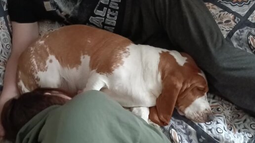Милота воскресного утра... Бассет Тильда не хочет ехать работать на дачу...