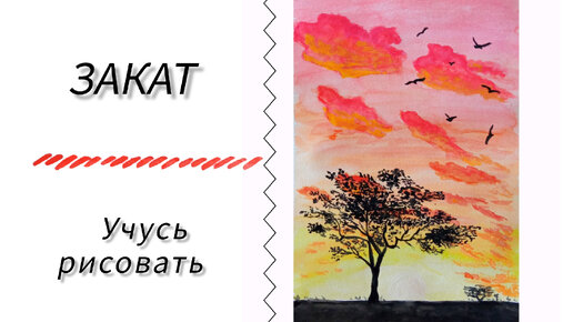 Красные облака. Закат в Африке. Акварель