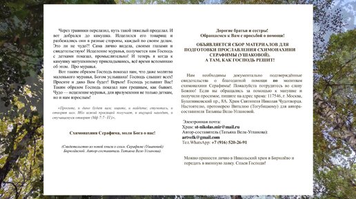 ОБЪЯВЛЯЕТСЯ СБОР МАТЕРИАЛОВ ДЛЯ ПОДГОТОВКИ ПРОСЛАВЛЕНИЯ СХИМОНАХИНИ СЕРАФИМЫ (УШАКОВОЙ).