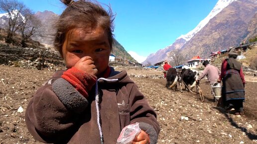 Ужин в тибетской деревне высоко в Гималаях. Жизнь в горах