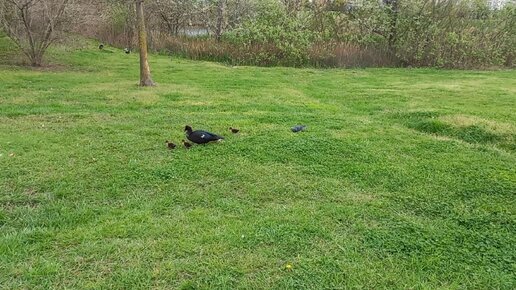 Утка с утятами свободно гуляет по орнитологическому парку в Сочи
