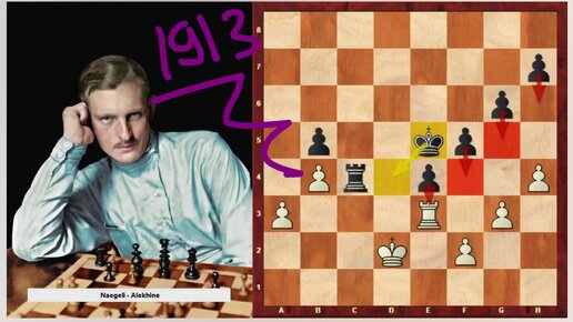 Одна из самых веселых партеек молодого маэстро Алехина: играя черными, жертвует коня и ладью за простой мат слоном и ферзем Родзинскому