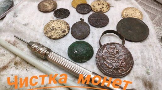 Чистка монет в домашних условиях с помощью шаберов и средством для очистки монет.