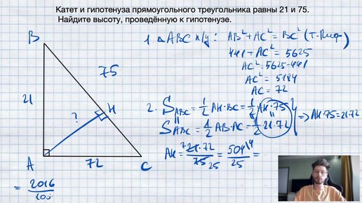 №5. Катет и гипотенуза прямоугольного треугольника равны 21 и 75. Найдите высоту, проведённую к гипотенузе.