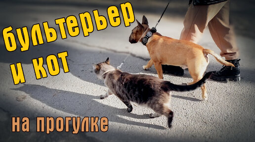 Выгуливаем кота с бультерьером. Минибуль Данчик и котик Пиксель.