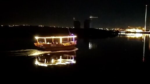 Ночные Эмираты: катер плывёт по мангровому озеру