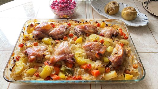 Овощное рагу с курицей в духовке. Нарезал, соединил, заправил и в духовку.