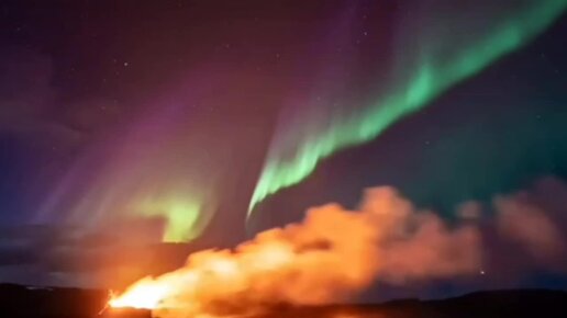 В Исландии одновременно сняли северное сияние и извержение вулкана