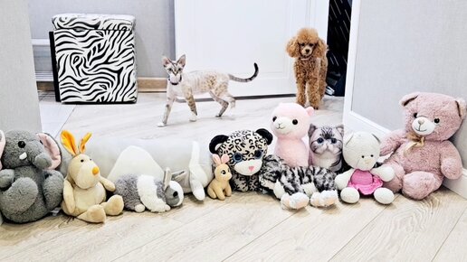 Кошка и собака преодолевают барьер в виде кучи мягких игрушек 🧸