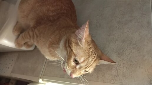 Кот сидит и ждёт.Персик любит,чтобы его обдували воздухом из фена. Если так не делать, то он лезет в раковину, чтобы лапами достать до фена