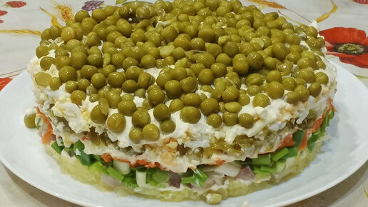 Слоёный салат с сельдью и зелёным горошком