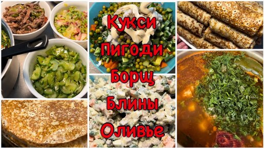 Борщ,Пигодьки, оливье и блины с грибами.