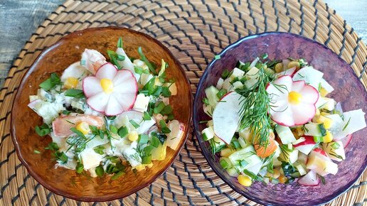 Овощной салат с сыром и кукурузой. Одна основа – две заправки.