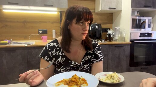 Семейный мукбанг/ На ужин у нас салат с морепродуктами/ Картошечка и говяжий гуляшь/