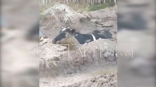 Экскаватор как кран вытаскивал корову, провалившуюся в болото