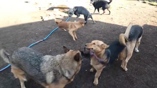 Щенки уже подросли и вписались в компанию взрослых собак