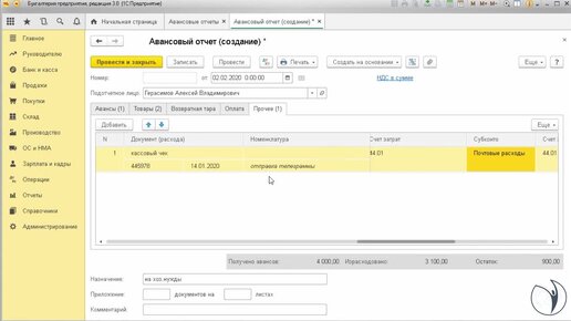 Как учесть материальные и почтовые расходы в авансовом расчете в 1С I Крысанова Анастасия. РУНО