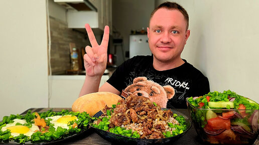 МУКБАНГ. ОБЖОР. ТУШЁНКА ВКУСНАЯ С ГРЕЧКОЙ, ЯИЧНИЦА НА САЛЕ, САЛАТ. АСМР.