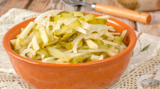Маринованные овощи и к мясу, и к рыбке подойдут. Салат с яблоком, маринованным огурцом и луком
