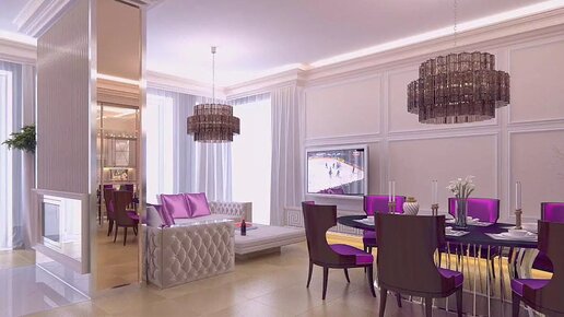 Интерьер квартиры с акцентом сиреневого цвета 👍 Дизайн интерьера квартиры в стиле арт-деко ✅ Дизайн квартиры в Москве на Садовом кольце