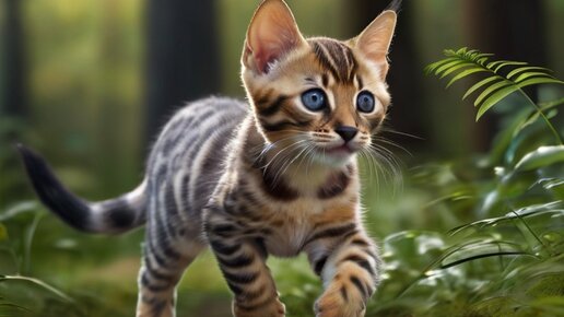 Бенгальский котенок Чарли идет по луже.