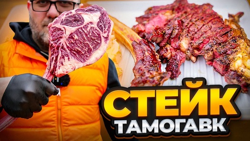 Стейк томагавк из мраморной говядины на угольном гриле. Гриль салат из овощей