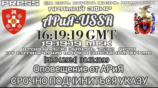 Вторник16Эйлетъ7532лето отС.М.З.Х.[28.04.2024]30.12.1899Оповещение от АРиЯ СРОЧНО ПОДЧИНИТЬСЯ УКАЗУ