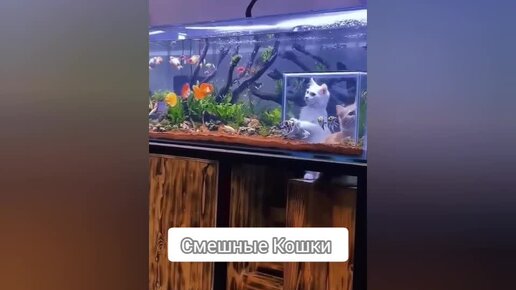 Кошка наблюдает за рыбками изнутри аквариума.