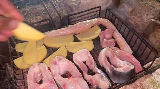 Вкусно,просто.Рецепт от Лудин Рахмана рыбы морского котика(как сказал продавец),молоки,брюшка семги на костре.