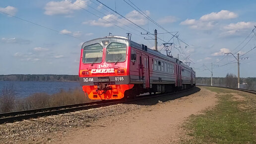 ЭД4М-0365 с именным названием "СМЕНА", следует на платформу Кавголово, вдоль Кавголовского озера. 29.04.23