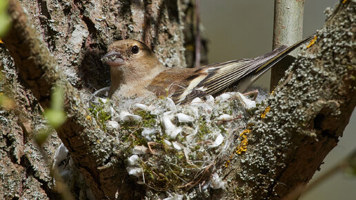 Самка зяблика строит гнездо