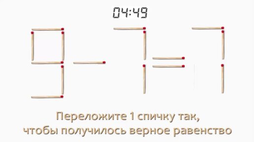 Задача 39. Переложите 1 спичку так, чтобы получилось верное равенство (9-7=7)