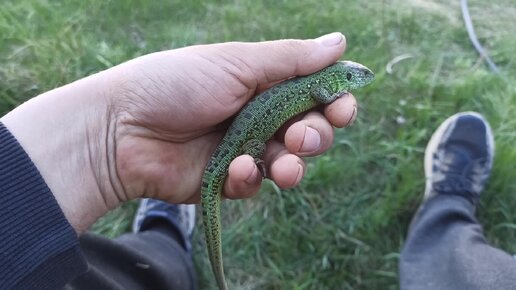 Впоймали зленую ящерицу. Беригите природу. Берегите животных.