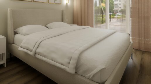 Светлая бежевая спальня со шкафом-купе и постерами в изголовье
