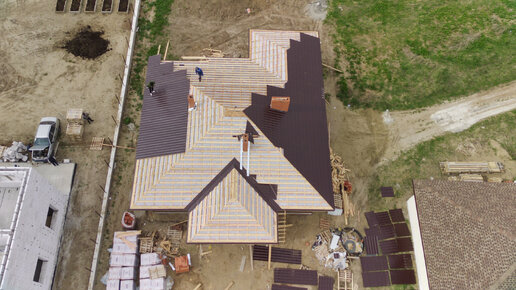 Завершающий этап работ по строительству кирпичного дома , монтаж металлочерепицы