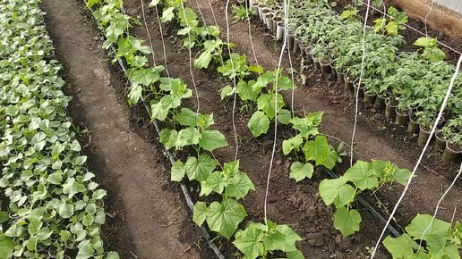 Теплица. 7 мая 2024 г. Начинаем подвязку огурцов. Они уже начинают цвести