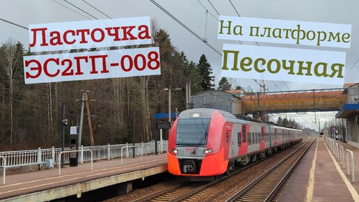 Ласточка ЭС2ГП-008 на скорости пролетает платформу Песочная в Петербурге