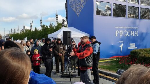 Kamazz из Астрахани на уличном концерте, в преддверии празднования Дня Победы, поёт песни военных лет на выставке Россия