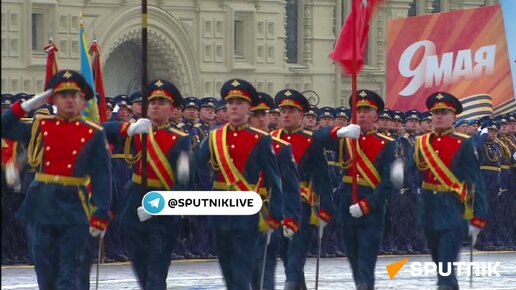 Военнослужащие Почетного Караула вносят на Красную площадь государственный флаг России и Знамя Победы в Великой Отечественной войне