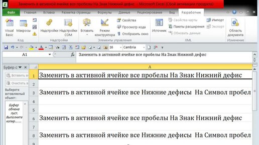 Заменить в активной ячейке все пробелы На Знак Нижний дефис