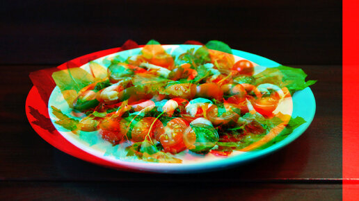 3D stereo red-cyan Салат из крапивы с креветками и помидорами