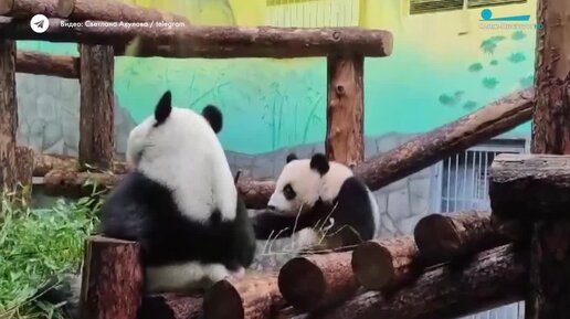 Панда Катюша ворует у мамы самую свежую веточку бамбука