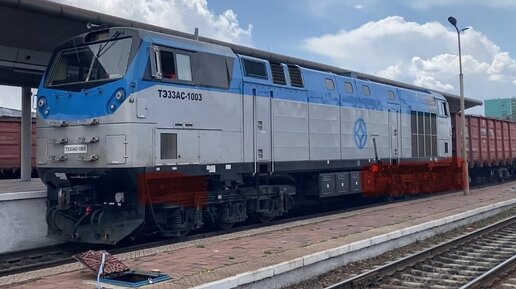 ТЭ33АС-1003 с составом полувагонов проносится по станции Улан-Батор. Монгольские железные дороги