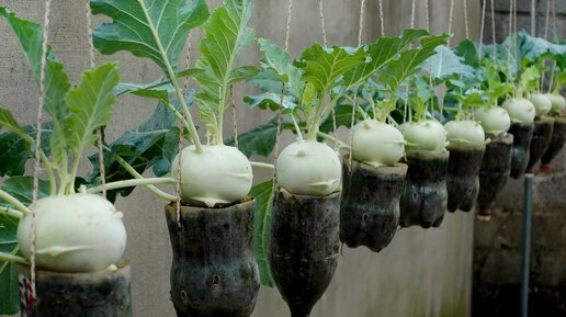 Выращивание кольраби в маленькой пластиковой горшке, было невероятно, что он всё равно дал такой высокий урожай