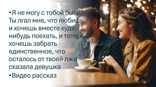 Ты лгал мне, что любишь и хочешь вместе куда-нибудь поехать, и теперь хочешь забрать единственное, что осталось от твоей лжи. Видео рассказ